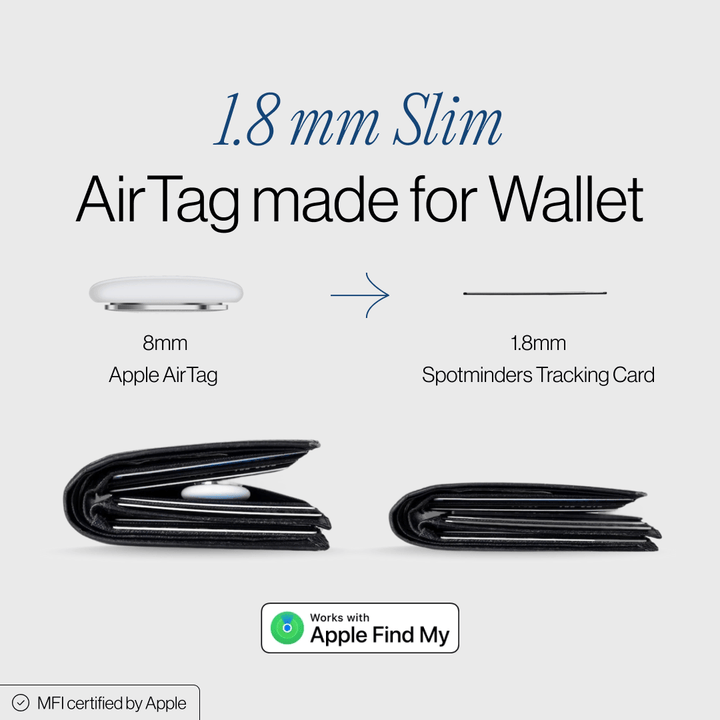 Spotminders Tracking Card works effortlessly with Apple Find My to help you keep track of your essentials. Just pair the ultra-slim 1.8mm card with your iPhone®, activate it via the Find My app, and locate your item from anywhere.